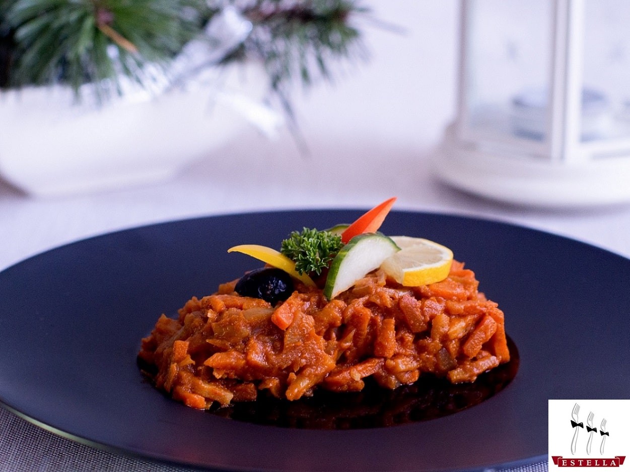 Dorsz po grecku. Cena za 1 porcję (100 g).